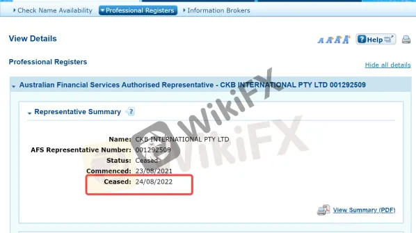 就在昨天8月24日,交易商CKB的澳大利亚授权牌照被停止授权!并且授权给CKB集团的这家公司实际也是没有经营零售外汇权限的。实际上CKB集团的ASIC的AR牌照只能给客户提供一些金融产品建议罢了!