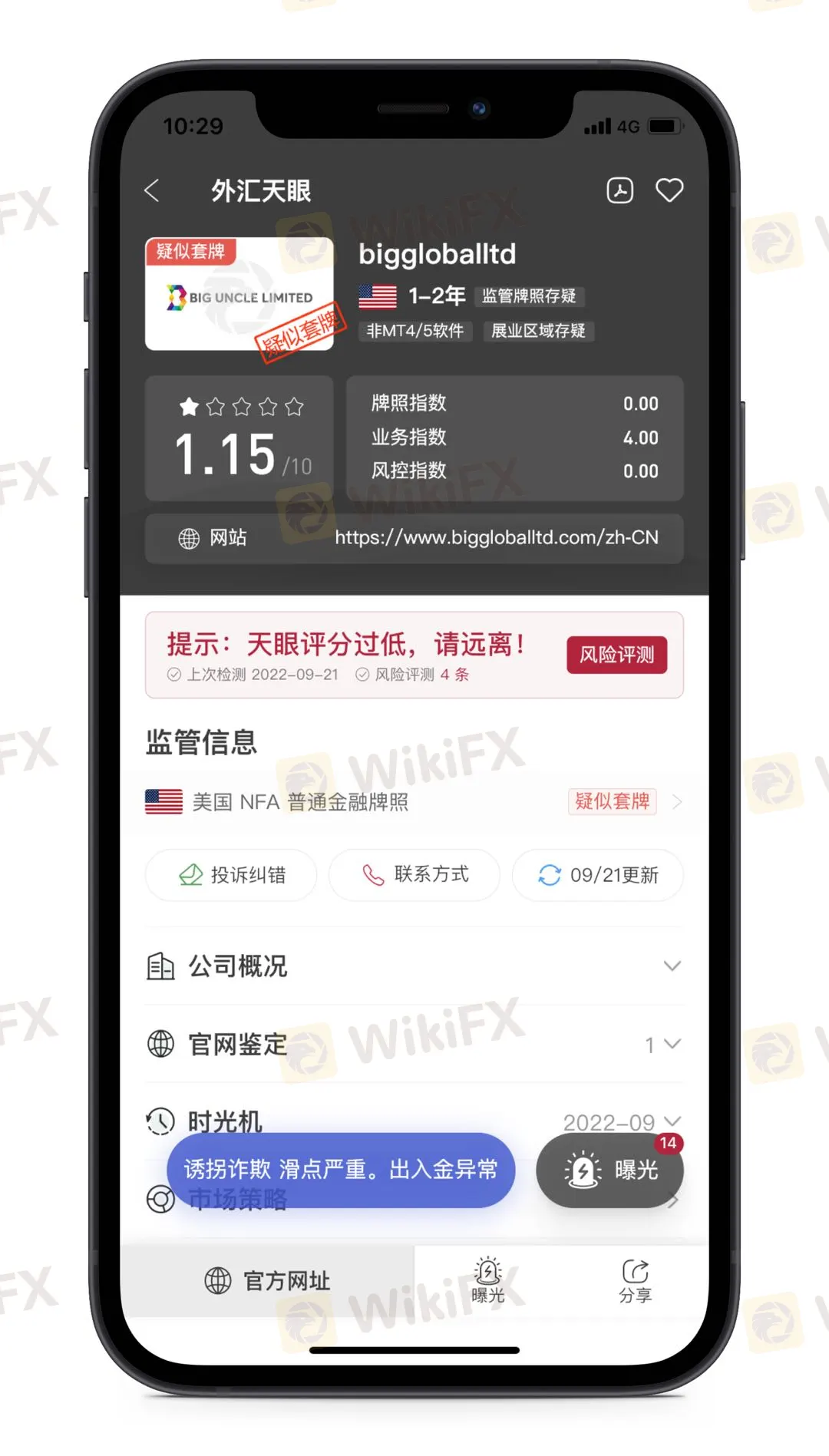 在外汇交易商中最重要的监管牌照方面,biggloballtd 平台并没有获取相应的牌照,对外宣称的美国全国期货业协会牌照(监管号:0546421)疑似套牌,请注意风险!也未经相关机构授权。