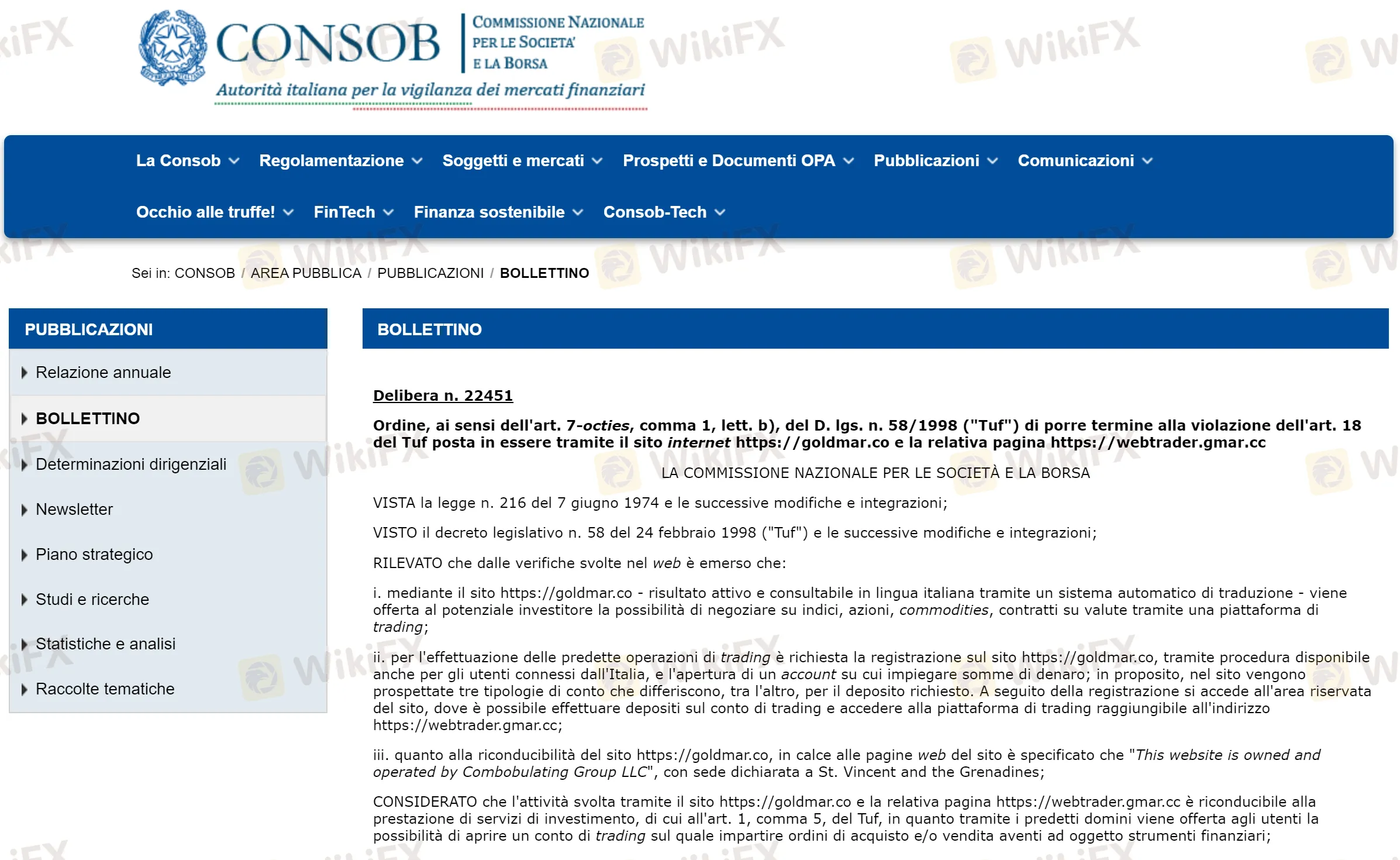 公告称:鉴于网站https://goldmar.co没有在 Consob 登记册中注册,未被授权向意大利公众提供投资服务。根据《金融综合法》第7条第8款b)项规定的打击非法行为的权力——Consob “可对未根据本法令授权通过互联网提供或进行投资服务或活动的任何人:[.] b) 命令终止违规行为”。
