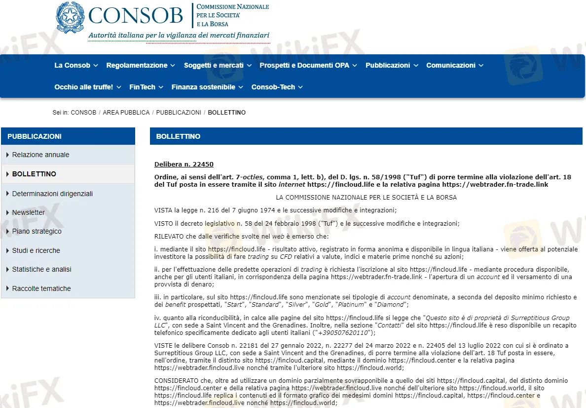 9月14日,意大利国家公司和证券交易所委员会(CONSOB)发布公告,根据第58/1998号法令(“Tuf”)规定,命令结束通过网站https://fincloud.life 和相关网页https://webtrader.fn-trade.link违反Tuf第18条的行为。