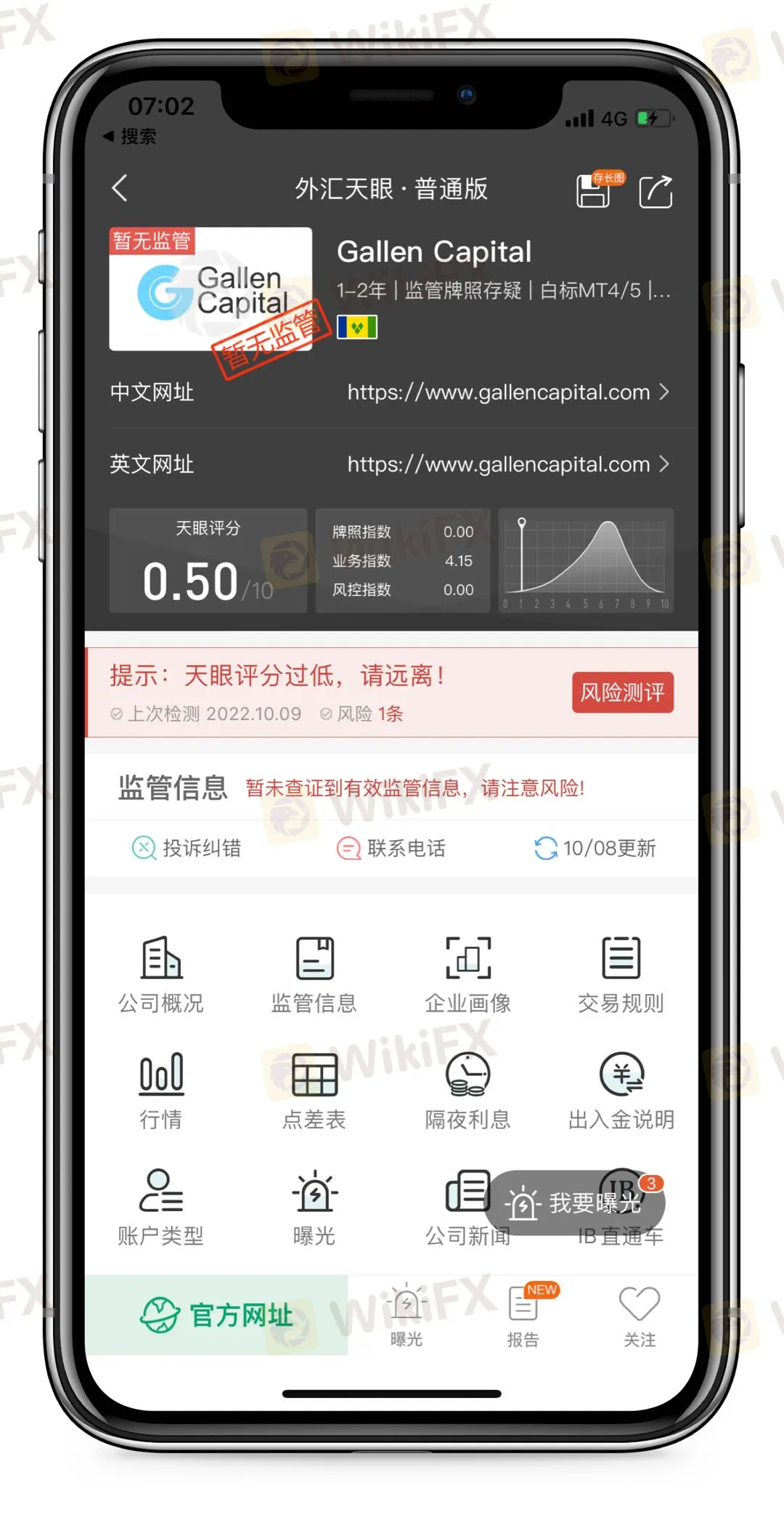其实有很多方法可以避免出现这样的情况,在做外汇和其他交易之前,可以在我们外汇天眼上面先检索一下该平台是否可靠,就拿Gallen Capital平台举例,在天眼首页搜索Gallen Capital可以得出如下结果
