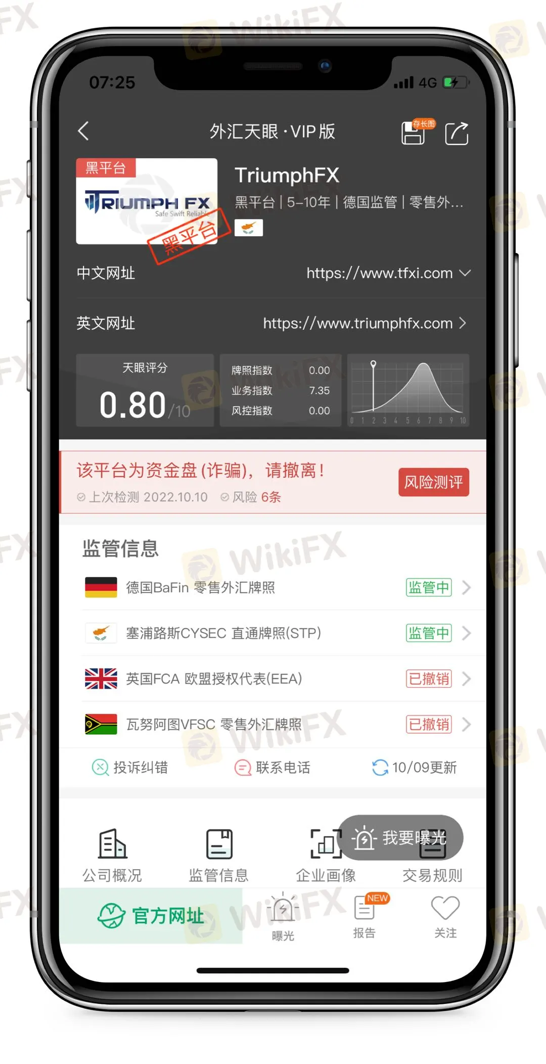 摘要:近日有多位投资者向wikifx投诉TriumphFX,称TriumphFX无法出金,提现延迟打款,目前已经无法到账,且大额出金根本不到账,以前提现小额时间周期从之前的3-5天,到现在个把星期,十来天没到账的很多 现在出金,出欧易,划款没到欧易的也有。其官网已经变成菠菜网站,疑似跑路。