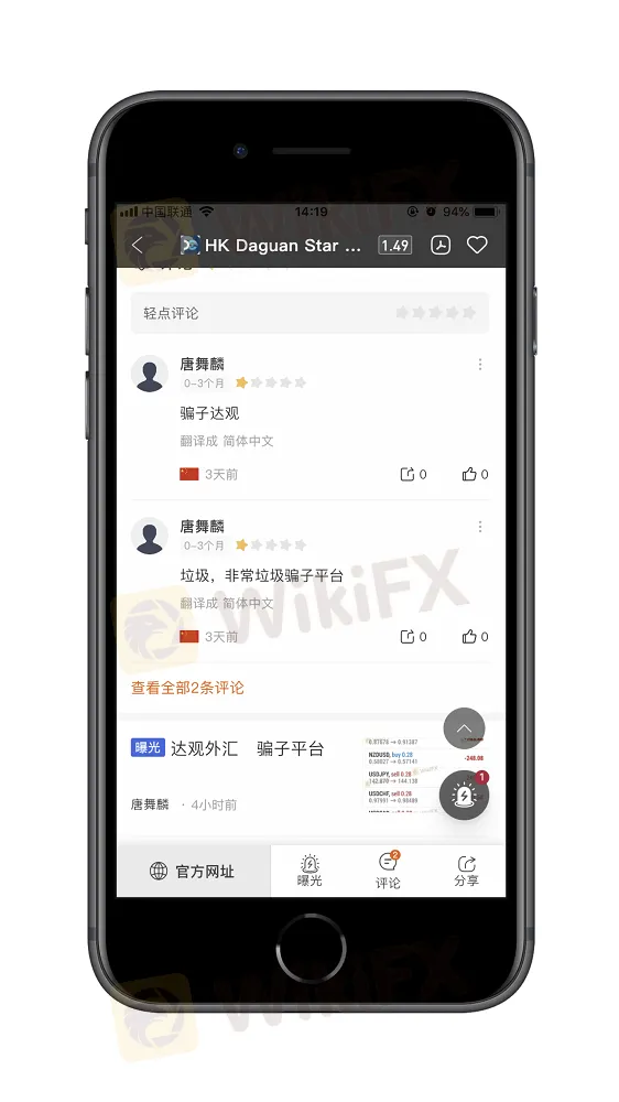 日前,一位来自中国香港的投资者“唐舞麟”在外汇天眼上曝光HK Daguan Star Technology Limited(达观外汇)是个骗子平台。