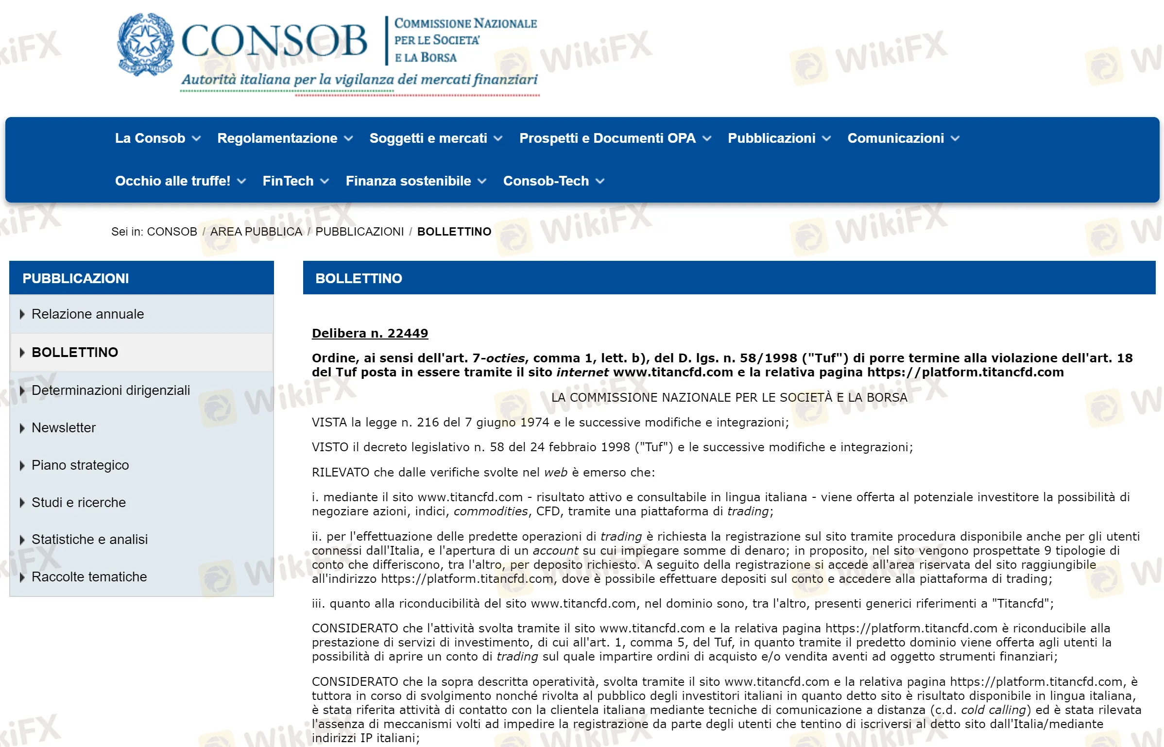 公告称:鉴于网站www.titancfd.com,无法追溯到任何被授权向意大利公众提供投资服务的实体,根据《金融综合法》第7条第8款b)项的规定——Consob “可对未根据本法令授权通过互联网提供或进行投资服务或活动的任何人:[.] b) 命令终止违规行为”。