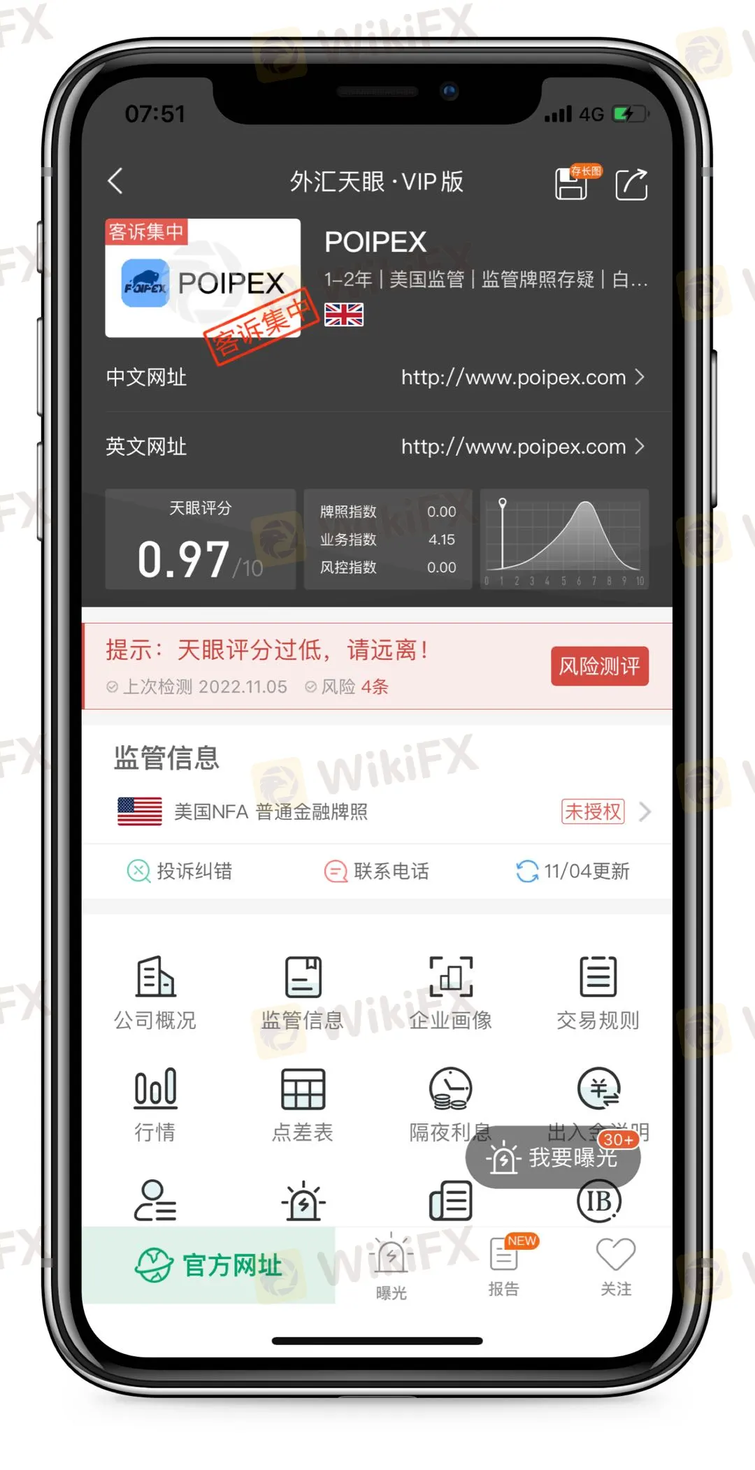 其实有很多方法可以避免出现这样的情况,在做外汇和其他交易之前,可以在我们外汇天眼上面先检索一下该平台是否可靠,就Poipex平台举例,在天眼首页搜索Poipex可以得出如下结果