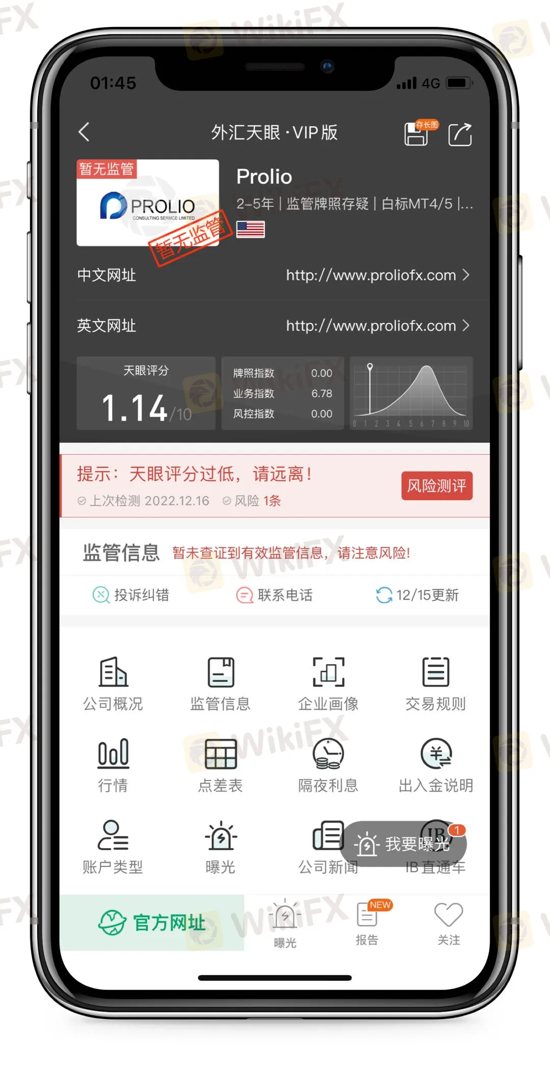 其实有很多方法可以避免出现这样的情况,在做外汇和其他交易之前,可以在我们外汇天眼上面先检索一下该平台是否可靠,就Prolio平台举例,在天眼首页搜索Prolio可以得出如下结果