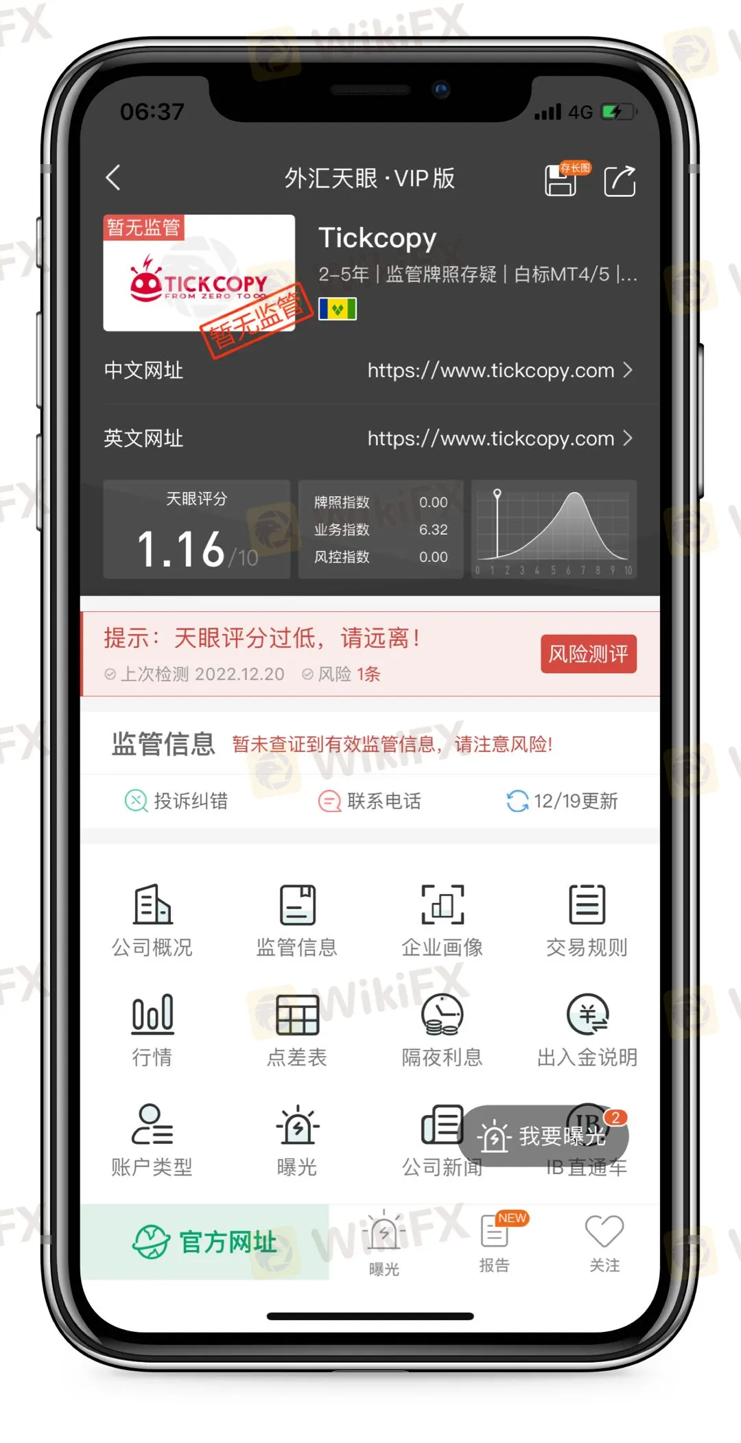 其实有很多方法可以避免出现这样的情况,在做外汇和其他交易之前,可以在我们外汇天眼上面先检索一下该平台是否可靠,就Tickcopy平台举例,在天眼首页搜索Tickcopy可以得出如下结果
