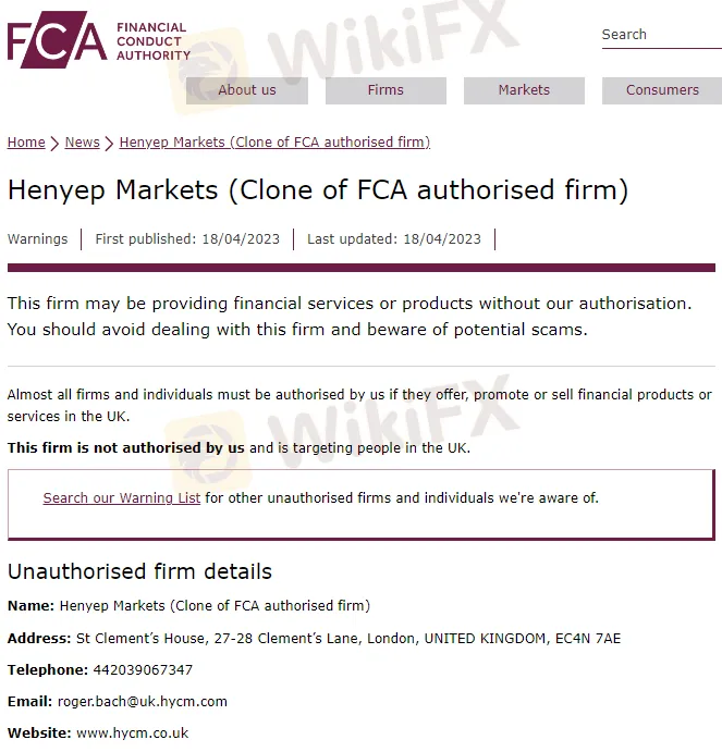 FCA警告称:Henyep Markets 在未经我们授权的情况下在英国提供金融服务或产品,如果一旦遭受资金损失,您将无法使用金融申诉专员服务或受到金融服务补偿计划 (FSCS) 的保护。