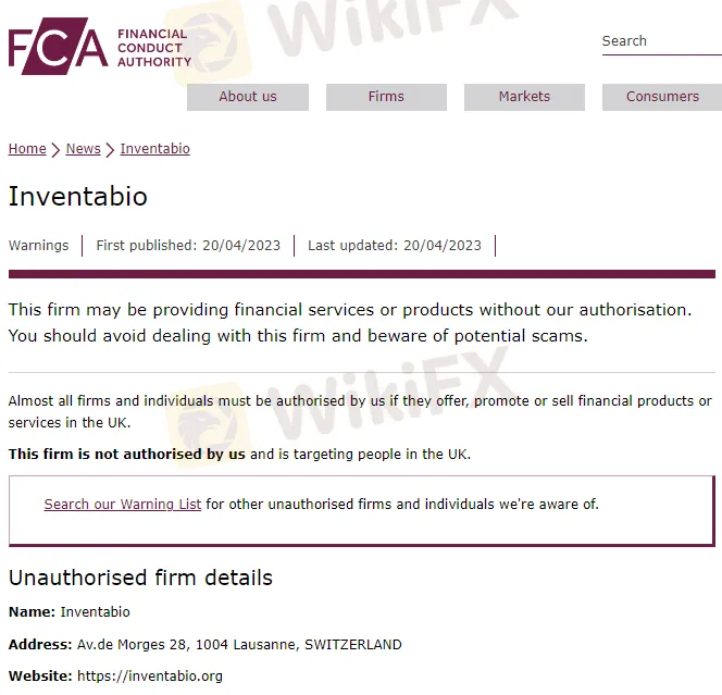 根据外汇天眼监测,4月20日,英国金融行为监管局( FCA )对 Inventabio 发出警告,提示投资者警惕与这家未经授权的公司打交道。
