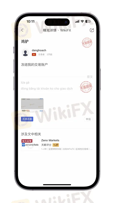 日前,一位来自越南的投资者向WikiFX举报Zeno Markets在他账户内仍有资金的情况下随意冻结其投资账户,并提供了其账户冻结情况截图如下: