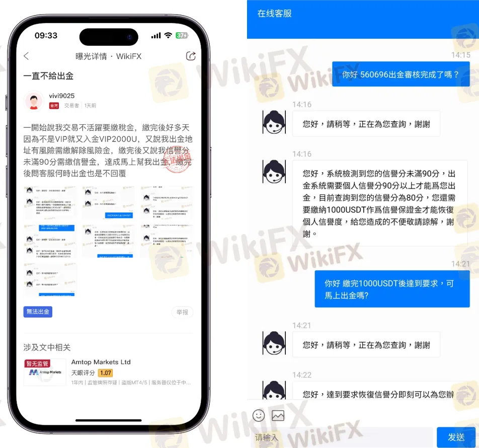 该投资者向WikiFX反映,他在Amtop Markets Ltd开设账户并进行交易,但上当其盈利达到预期欲申请提款时,客服以其“信誉分不达标”为由拒绝提现申请。据客服解释,平台出金系统要求账户信誉分必须达到90分才可提款,而投资者账户信誉分仅为80分,必须先支付1000美元作为“信誉保证金”才能恢复提款权限。