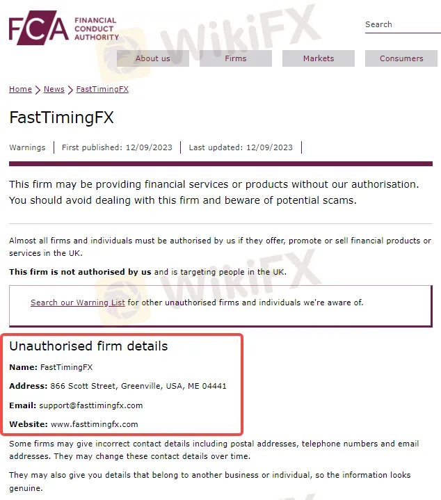 FCA认为FastTimingFX公司存在欺诈投资者、非法集资等严重违法行为的可能。并警告投资者不要与该公司进行任何交易或投资,如果一旦遭受资金损失,将无法使用金融申诉专员服务或受到金融服务补偿计划 (FSCS) 的保护。