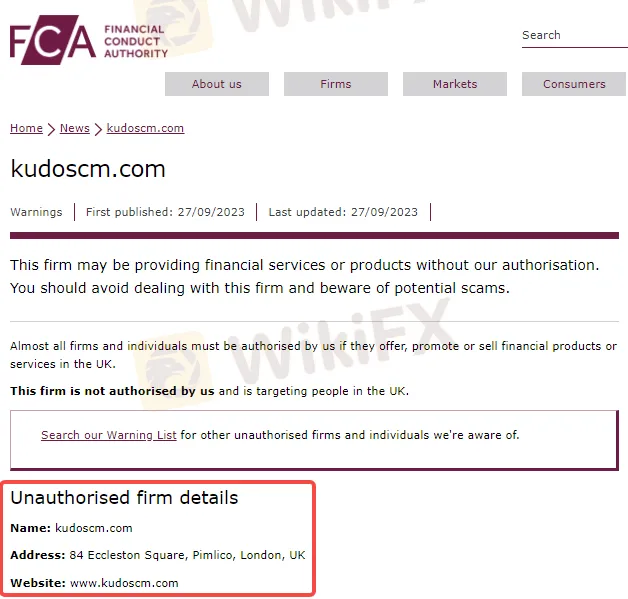 9月27日,英国金融行为监管局(FCA)发布了一则投资者警示公告,公告内容称一家名为“kudoscm.com”的公司可能在未获FCA授权的情况下,向投资者非法提供金融服务或产品。