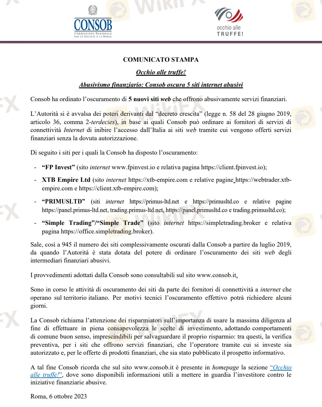 CONSOB要求互联网服务提供商在技术可行的情况下尽快关闭用户对上述非法网站的访问。自2019年7月该机构获授权关闭非法网站以来,累计封锁的网站总数已增至945个网站。