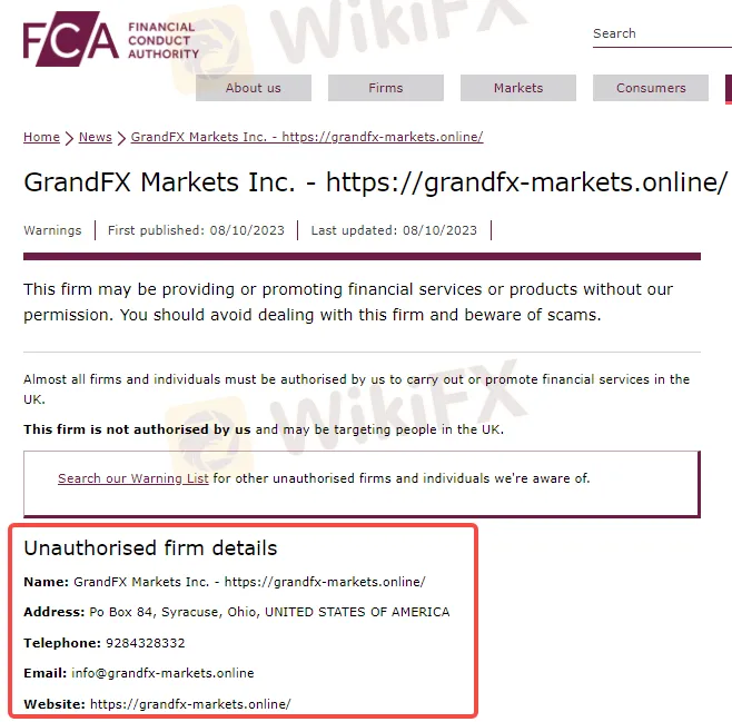 10月8日,英国金融行为监管局(FCA)发布了一则投资者警示公告,公告内容称一家名为“GrandFX Markets Inc”的公司可能在未获FCA授权的情况下,向投资者非法提供金融服务或产品。