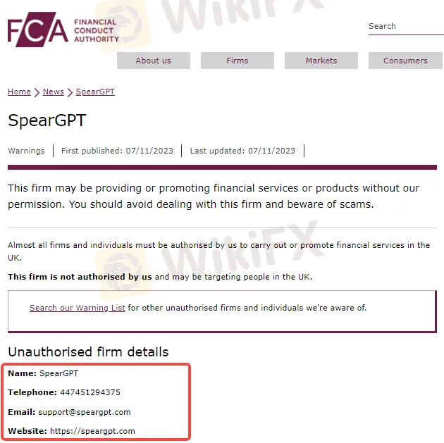 FCA认为SpearGPT公司存在欺诈投资者、非法集资等严重违法行为的可能。并警告投资者不要与该公司进行任何交易或投资,如果一旦遭受资金损失,将无法使用金融申诉专员服务或受到金融服务补偿计划 (FSCS) 的保护。