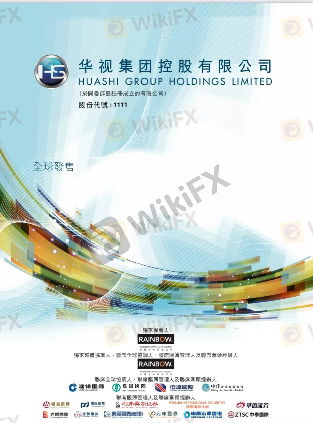 2023年11月10日,建银国际金融有限公司(“建银国际”)作为联席全球协调人、联席账簿管理人及联席牵头经办人,协助华视集团控股有限公司( “华视集团”,1111.HK)于香港联交所主板成功挂牌上市。本次全球发售12,500万股,集资额约1.3亿港元。