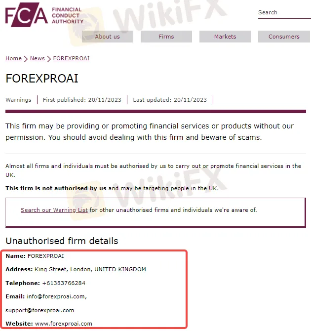 FCA认为FOREXPROAI存在欺诈投资者、非法集资等严重违法行为的可能。并警告投资者不要与该公司进行任何交易或投资,如果一旦遭受资金损失,将无法使用金融申诉专员服务或受到金融服务补偿计划 (FSCS) 的保护。