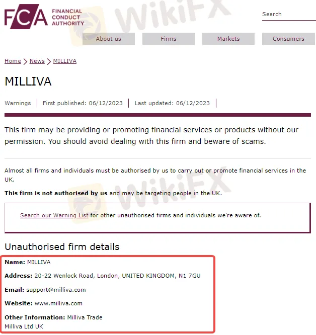 FCA认为MILLIVA存在欺诈投资者、非法集资等严重违法行为的可能。并警告投资者不要与该公司进行任何交易或投资,如果一旦遭受资金损失,将无法使用金融申诉专员服务或受到金融服务补偿计划 (FSCS) 的保护。