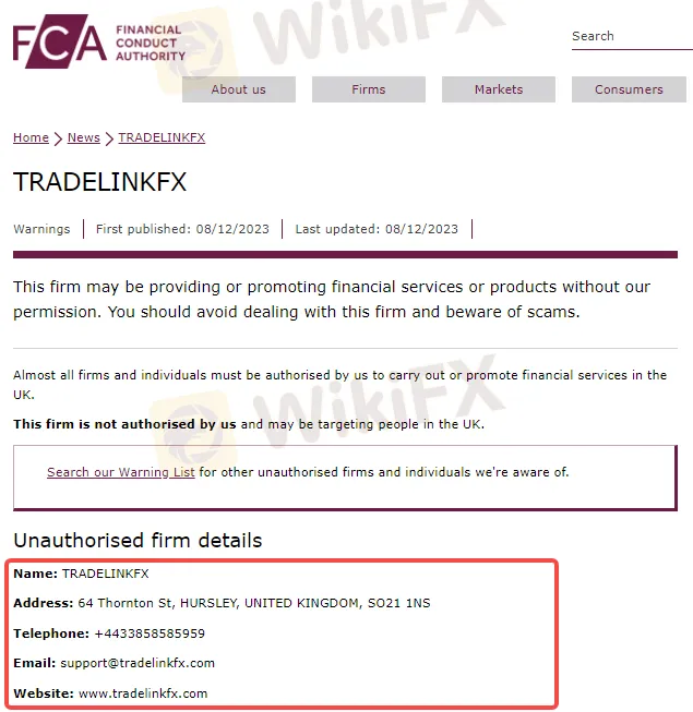 FCA认为TRADELINKFX存在欺诈投资者、非法集资等严重违法行为的可能。并警告投资者不要与该公司进行任何交易或投资,如果一旦遭受资金损失,将无法使用金融申诉专员服务或受到金融服务补偿计划 (FSCS) 的保护。