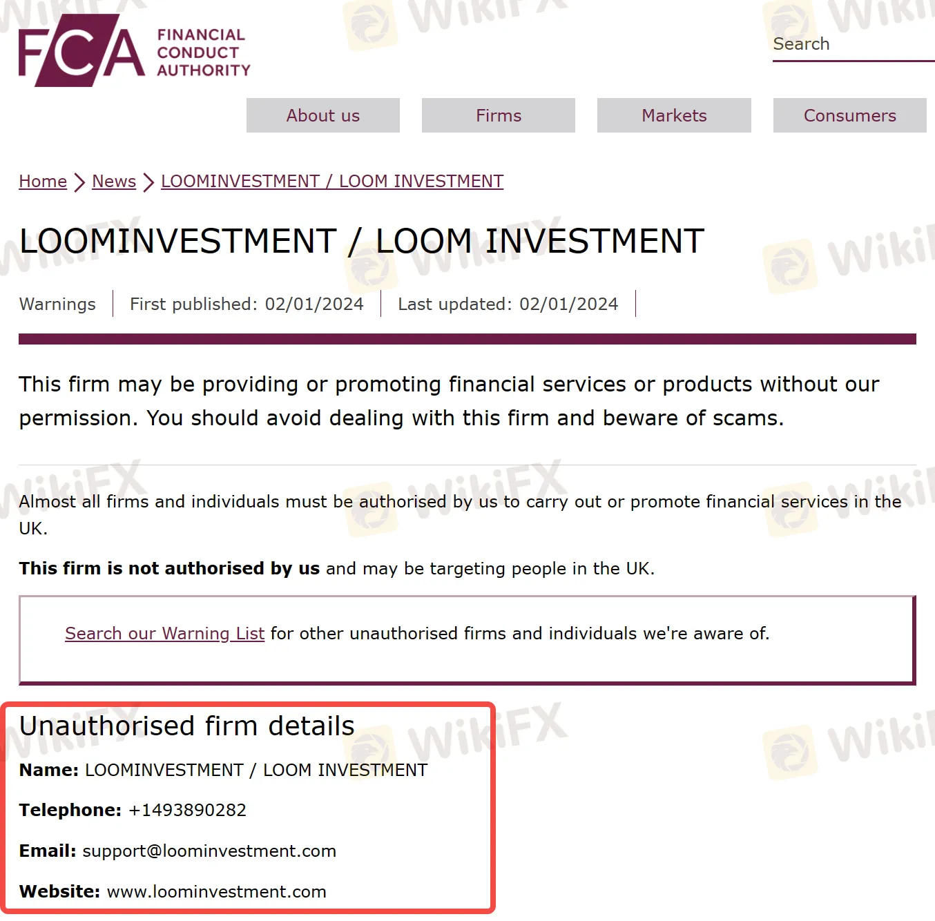 FCA认为LOOMINVESTMENT/LOOM INVESTMENT存在欺诈投资者、非法集资等严重违法行为的可能。并警告投资者不要与该公司进行任何交易或投资,如果一旦遭受资金损失,将无法使用金融申诉专员服务或受到金融服务补偿计划 (FSCS) 的保护。