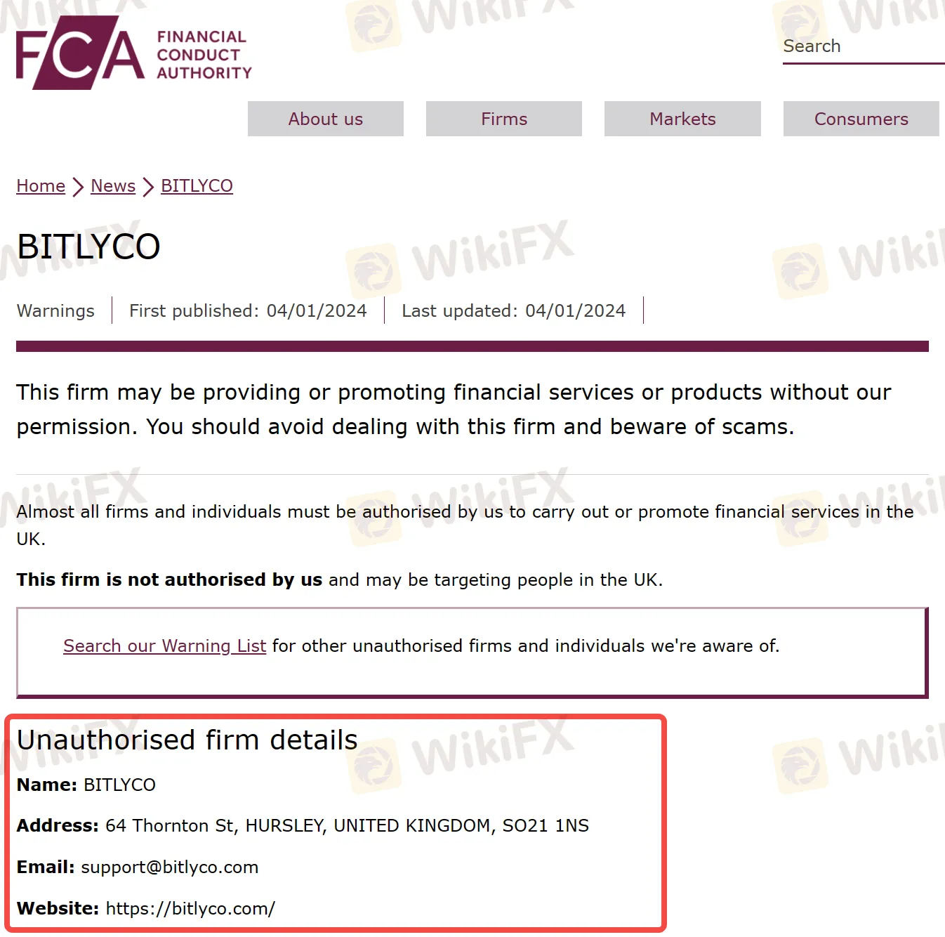 FCA认为BITLYCO存在欺诈投资者、非法集资等严重违法行为的可能。并警告投资者不要与该公司进行任何交易或投资,如果一旦遭受资金损失,将无法使用金融申诉专员服务或受到金融服务补偿计划 (FSCS) 的保护。