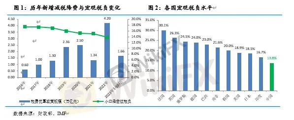 近年来,减税降费已成为积极财政政策的重点,与此相对应,我国宏观税负持续下行,目前已降至全球偏低水平。2022年,我国小口径宏观税负为13.8%,明显低于美国、日本、英国等发达经济体。