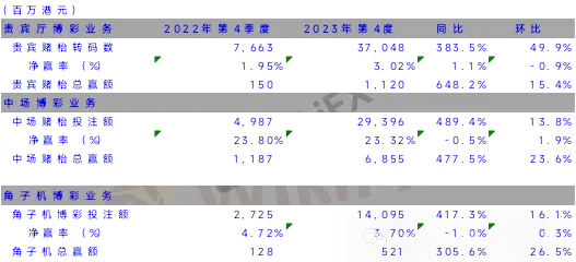 于2023年第4季度, 美高梅中国的收益诤额为76.8亿港元, 同比上升462.0%, 环比增长20.8% (达2019年同期的134.9%); 经调整后的EBITDA环比增长16.2%到21.9亿港元(为2019年同期的140.6%,创新高 ), EBITDA率环比减少1.1个百分点到28.5% , 受推广费用增加的影响)。 期内, 贵宾业务投注额同比上升383.5%, 环比增长49.9%到370.5亿港元(恢复到2019年同期的56.0%); 中场业务同上升477.5%, 环比上升23.6%到68.6亿港元(表现大幅超越2019年同期,增加73.8%)。 市场份额提升2.0个百分点到16.3%。 总体第4季度业绩表现强劲。 集团的总流动资金继续增加到20.0亿美元 (包括5.4亿美元的现金)。 据了解,1月份的表现维持强劲; 市场份额提升到20%,所有业务的表现和经调整后的EBITDA比去年十月份的表现更好。 未来,集团会继续优化产品(包括博彩区和酒店房间)去提升回报,及集中服务好中场和高端中场的客户并拓展海外客户。