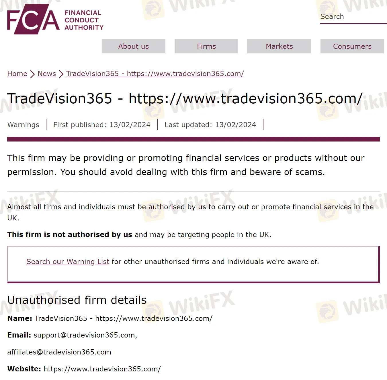 2月13日,英国金融行为监管局(FCA)发布了一则投资者警示公告,公告内容称一家名为TradeVision365的公司可能在未获FCA授权的情况下,向投资者非法提供金融服务或产品。