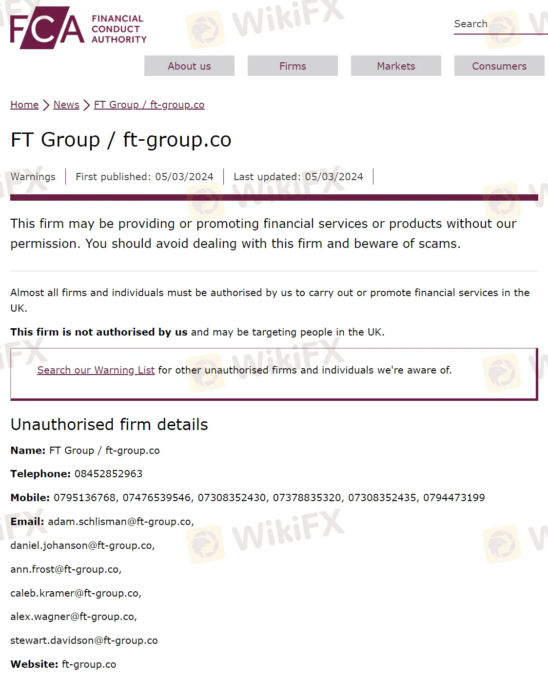 FCA表示,根据英国法律,几乎所有在英国境内提供、推广或销售金融产品或服务的公司和个人,都必须获得FCA的正式授权许可。但据FCA调查,FT Group / ft-group.co从未获得过FCA的任何形式的金融业务许可。