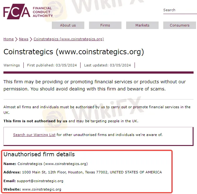 目前,该平台官网仍能够正常访问,这也意味着可能有更多的投资者面临潜在损失。根据其官网介绍,Coinstrategics作为一家在线投资平台,产品服务涵盖加密货币挖矿、外汇交易和复制交易等,监管方面其宣称受到金融行为监管局 (FCA) 的授权和监管。但是很明显,FCA已经发布公告表明Coinstrategics并未获得FCA授权,不受FCA监管。