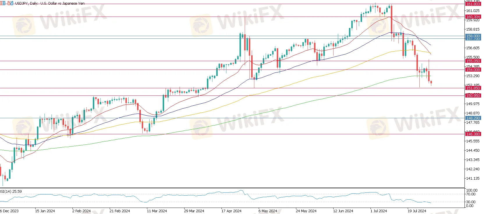 美元兑日元目前徘徊于近三个月的低点,而该低点是早前日本央行对日元进行干预后,日元强劲而美元兑日元一度创下的低点,也是早前在三月份期间美日突破的近35年高点。因此,151.85 – 150.95 是美日目前最为关注的水平。