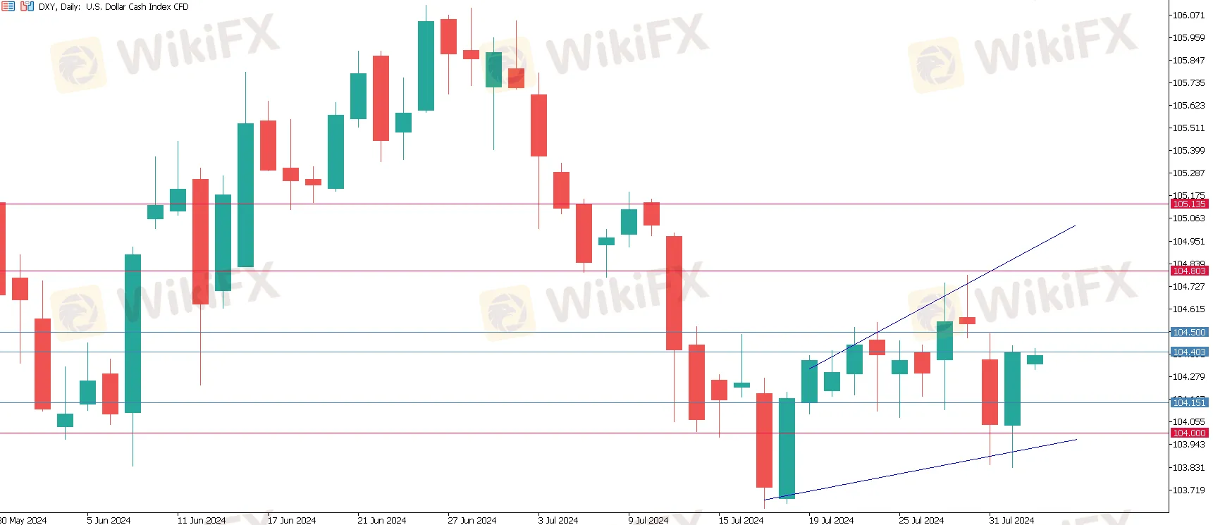 从较短周期四小时图来看,美元指数形成了一个上升扩展楔形。交易者应关注该扩展楔形是否会出现突破的可能性。在阻力水平方面,104.40 至 104.50 仍然是值得关注的关键区域。