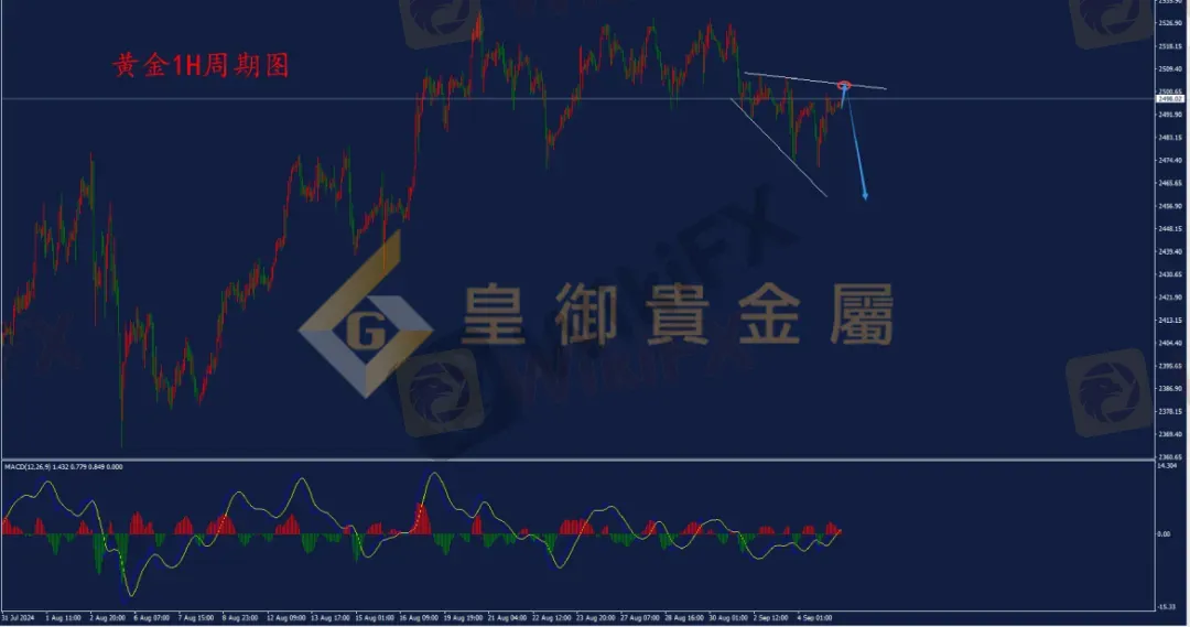 从1H周期走势结构看,近日黄金延续震荡回落,最低跌至2471附近。当前行情依旧处于震荡下行格局,并构建出喇叭口下跌形态,上方重要阻力位2505附近,此位置未能上破之前,短线可以继续做空为主。从MACD指标来看,双线处于零轴上方多头区域,但双线金叉往上,表明短线行情处于上涨中,日内操作可等待金价反弹至2505附近尝试空单。