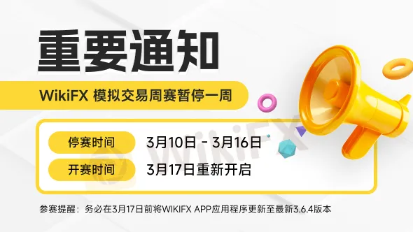 为给您提供更优质的服务体验,WikiFX模拟交易周赛将于3月10日-3月16日暂停一周,并于3月17日(周一)全新回归!此次产品升级将优化交易系统稳定性、提升数据统计效率,助您更流畅地施展交易策略。请所有参赛用户务必于3月17日前将APP更新至最新3.6.4版本,旧版本将无法记录比赛成绩。对给您带来的不便,我们深表歉意,感谢您一路以来的支持与包容!