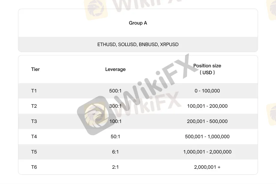 分级保证金制度(适用于 MT4 与 MT5)涵盖所有加密货币 CFD。不同币种组别会依据持仓规模而有不同的保证金需求。