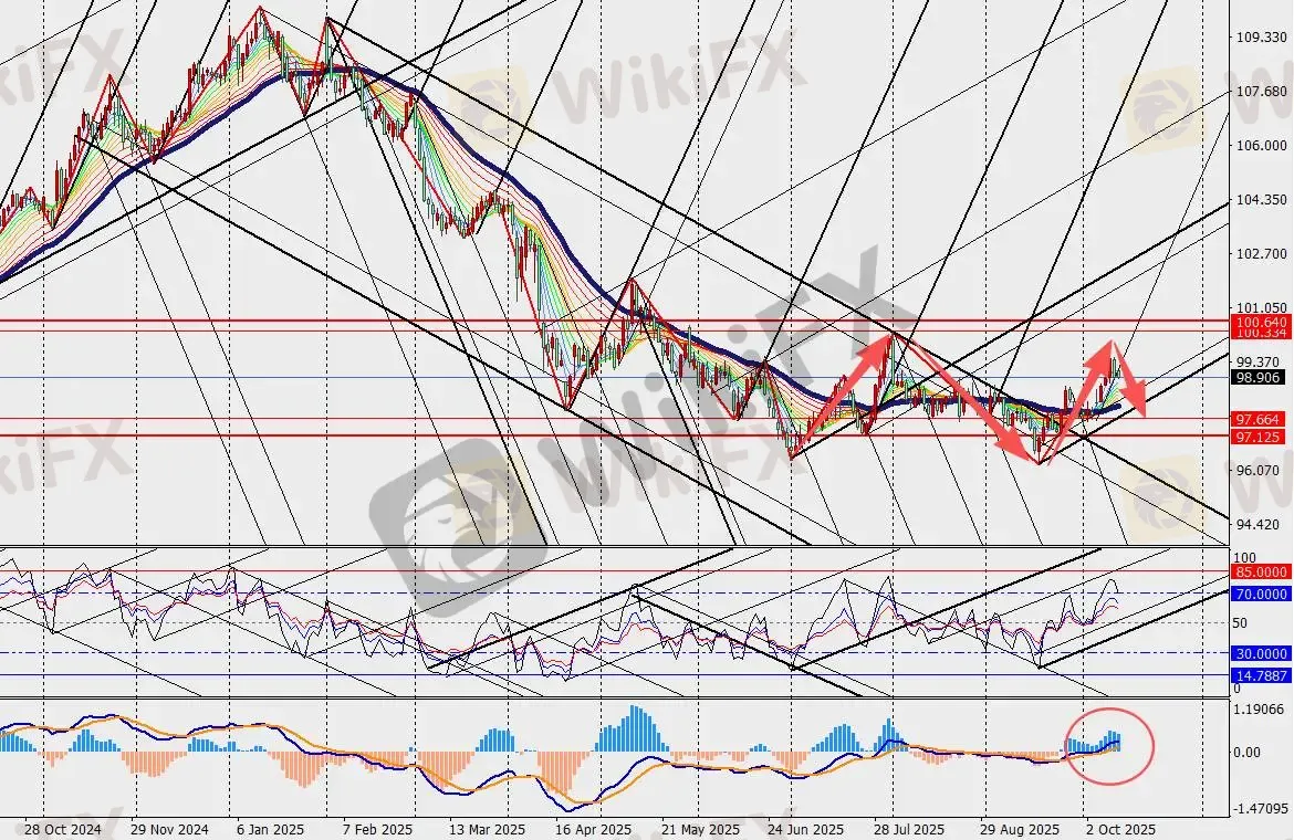 美元指数日线级别遇阻回落,MACD双线和量能柱开始缩量。沃勒对政策的谨慎看法也延伸到了经济领域。在劳动力市场方面,过去几个月可能出现了失业。在通胀方面,他表示他仍然认为特朗普关税的影响将是暂时的。
