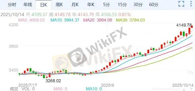 周一(10月13日)现货黄金价格首次突破每盎司4100美元大关,创下历史新高4116.87美元/盎司,当前国际贸易紧张、地缘政治不确定性和货币政策宽松预期,继续给金价提供上涨动能。黄金今年以来已累计上涨56%,在上周突破4000美元里程碑后,继续保持强劲势头。