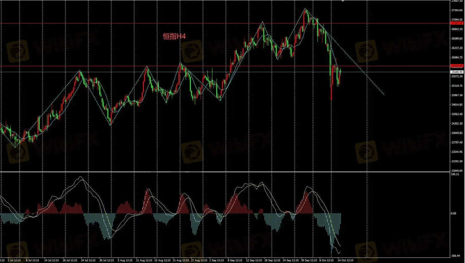 恒生指数持续大幅度回调,当前指数价格下破26000关口,短期持续看空;但需警惕H4图表目前仍处于多头结构中。