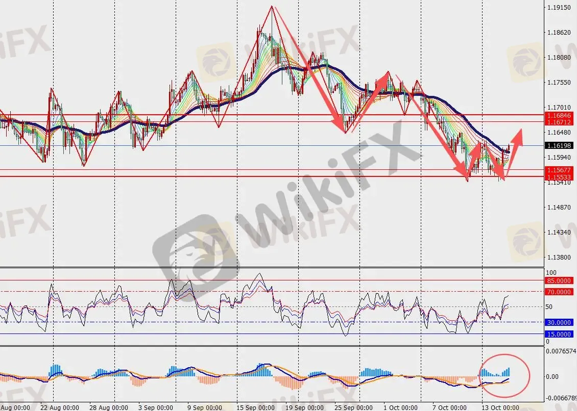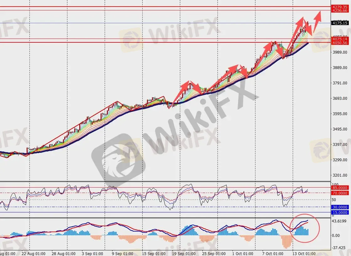 技术面:黄金H4级别持续上涨,并在48日多空分界线上方运行。此外,MACD双线和量能柱在零轴上方再次扩张。美国政府长期停摆引发经济不确定性、贸易紧张局势再度升温以及俄乌冲突风险升级,这些因素可能持续为黄金提供支撑。