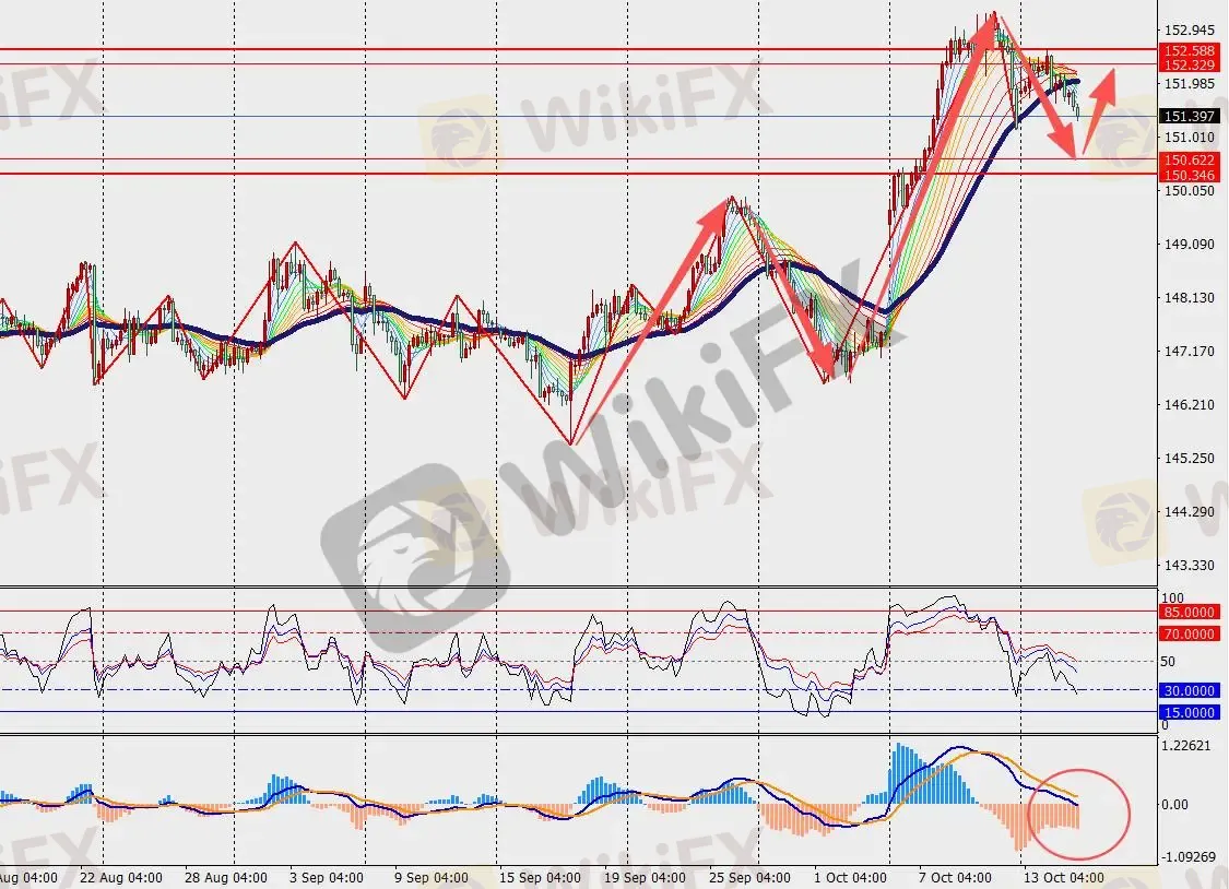 技术面:美元兑日元H4级别震荡回调,并在48日多空分界线下行运行。另一方面,MACD双线和量能柱在零轴上方向下扩张。随着日本公明党宣布退出执政联盟,日本朝野政党之间的角力与拉锯战加剧。