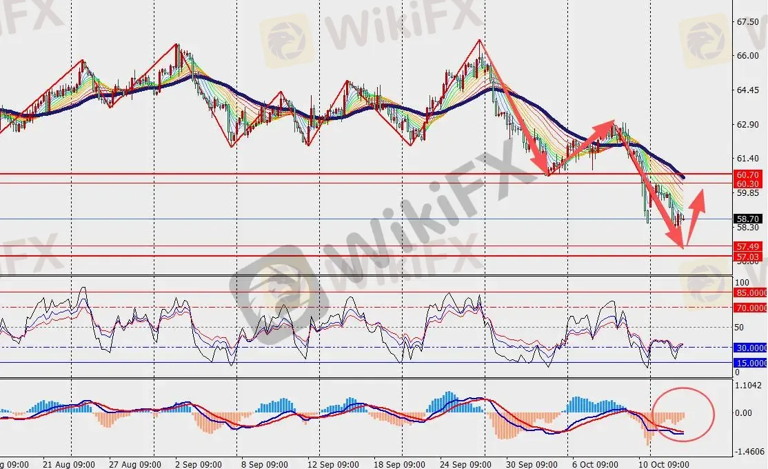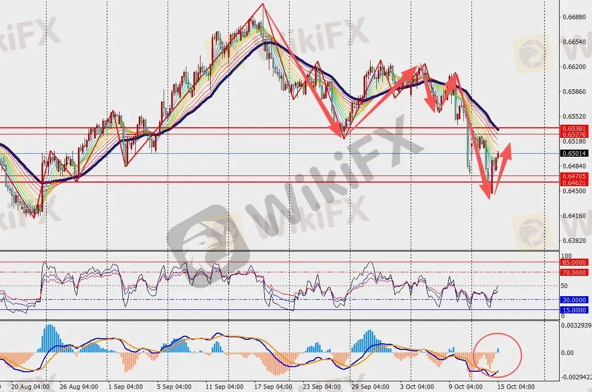 技术面:澳元兑美元H4级别下跌反弹,但依旧在48日多空分界线下方运行。此外,MACD双线和量能柱在零轴下方金叉扩张。市场普遍预计,在9月将官方现金利率维持在3.6%不变后,澳洲联储将继续按兵不动。