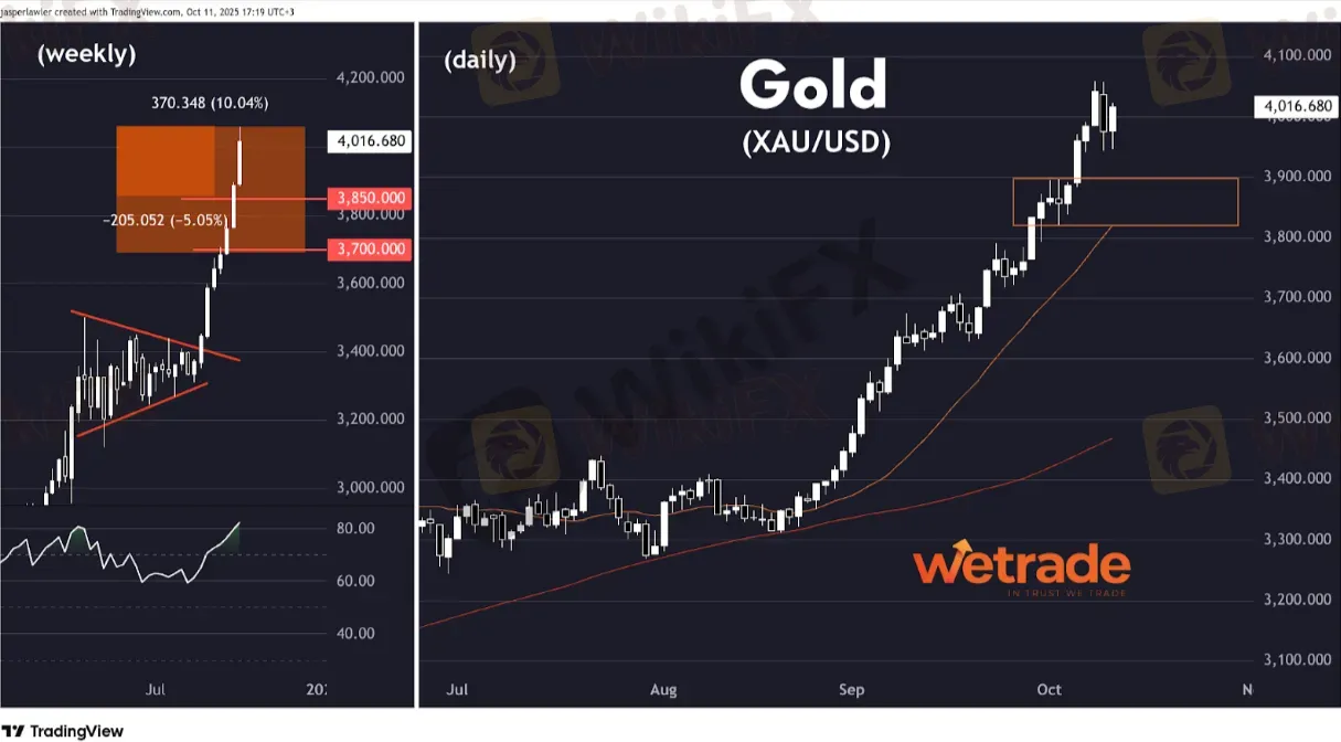 尽管周四日线图出现巨大的看跌吞没形态,但黄金周五反弹,连续第八周上涨,触及每盎司4100美元附近的历史新高。