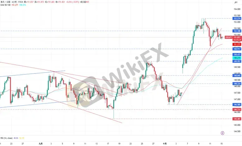 美元/日元自153.274水平回落后,价格维持在EMA50上方盘整。上涨方面,美元/日元目前的阻力是10月10日的高点153.274,再来是2月12日的高点154.797。下跌方面,美元/日元初步的支撑为10月10日低点151.102,再来是由前一个高点的阻力转变成的149.957水平。