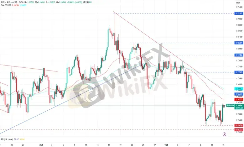 CPT Markets分析师指出,欧元/美元在1.15420的支撑水平反弹,尽管价格在底部形成双底W型态,但受EMA50均线以及下跌趋势线的压力影响,前景仍然保持看跌。下跌方面,欧元/美元目前的支撑为10月9日的低点1.15420,再来是8月5日的低点1.15277。上涨方面,欧元/美元目前的阻力为10月9日的高点1.16481,再来是10月6日的高点1.17209。