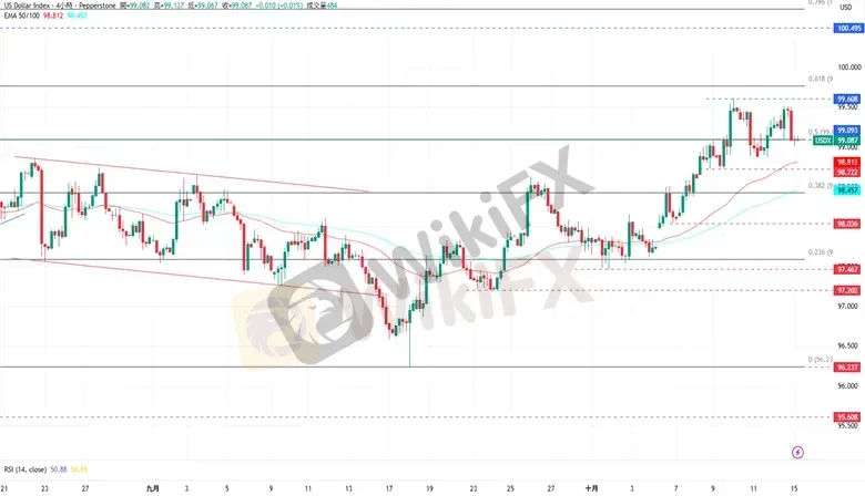 CPT Markets分析师指出,美元指数维持在99.608水平下方盘整,只要98.722的支撑水平未被突破,就仍有进一步上涨的可能。上涨方面,美元指数目前的阻力为10月9日的高点99.608,再来是8月1日的高点100.282水平。下跌方面,美元指数目前的支撑为10月8日的低点98.722,接着是10月6日的低点98.036。