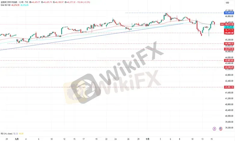 道琼指数在突破EMA50后开始回测,若能站稳至上方,将进一步测试46600~46800点水平。上涨方面,道琼指数目前的阻力为10月10日高点46641点,再来是10月3日的高点47049点。下跌方面,道琼指数接下来的支撑为10月14日低点45452点,接着为10月2日的低点44948点。