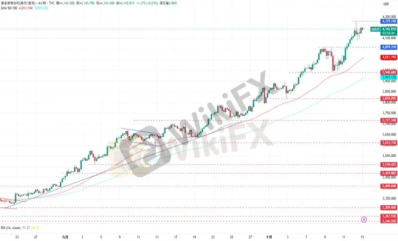 CPT Markets分析师指出,黄金价格在4179美元下方盘整,须注意RSI指针显示超买讯号,价格存在回落的可能。上涨方面,黄金目前的阻力为10月14日高点4179.74美元,再来为4200美元水平。下跌方面,黄金初步的支撑为10月14日低点4089.80美元与4000美元关口,再来是10月9日的低点3943美元。