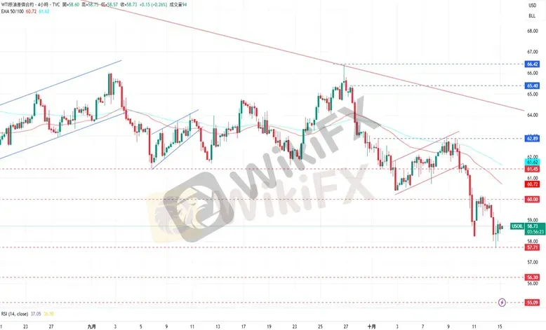 WTI原油开始测试下方57.71美元的支撑水平,受EMA50的负面压力影响,价格走势仍偏向看跌。上涨方面,WTI原油目前的阻力为10月13日的高点60.17美元,再来是EMA50所在的60.72美元。下跌方面,WTI原油接下来的支撑为10月14日的低点57.68美元,再来是5月1日的低点56.36美元。