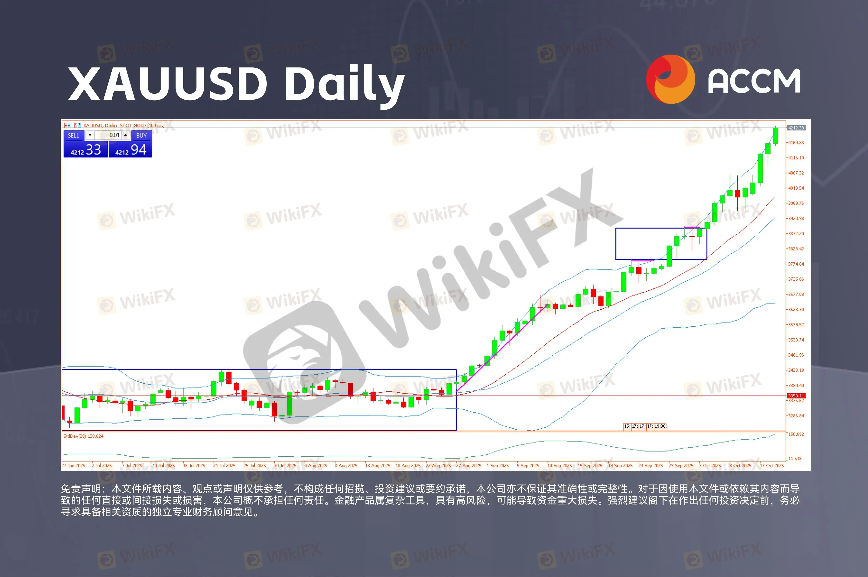 美元走弱,加上美中贸易紧张再起引发避险买盘,黄金价格继续刷新纪录。现货金价再涨1.2%,至每盎司4,189美元,盘中一度突破4,200美元关口。